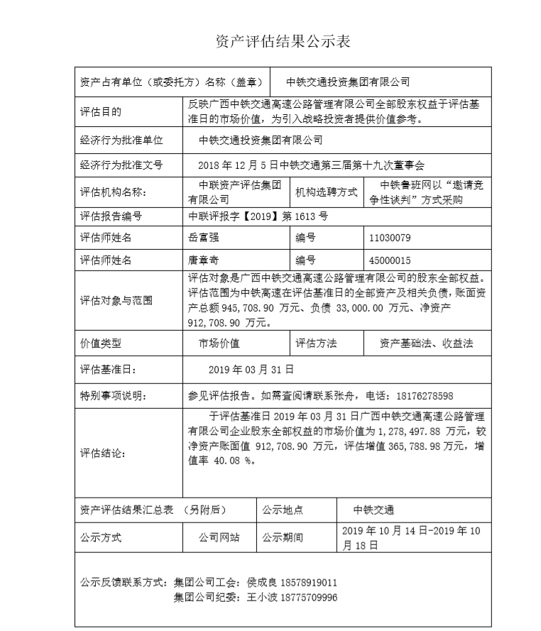 2018年12月5日,经中铁交通集团第三届第十九次董事会审议通过引入战略投资者的议案,并就中铁高速全部股东权益组织了资产评估。根据国资委《关于建立中央企业资产评估项目公示制度有关事项的通知》(国资发产权〔2016〕41号),以及股份公司《金年会娱乐股份有限公司资产评估公示暂行办法》(中铁股份财务〔2016〕153号)的要求,现将资产评估结果进行公示。