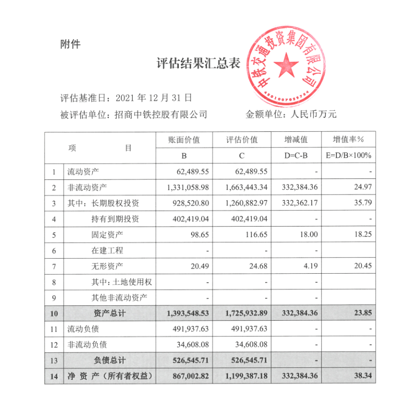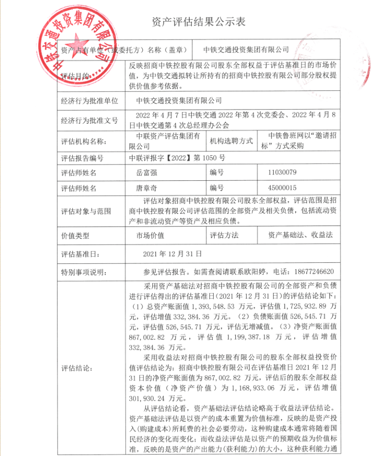 关于招商中铁控股有限公司股东全部权益价值评估结果的公示