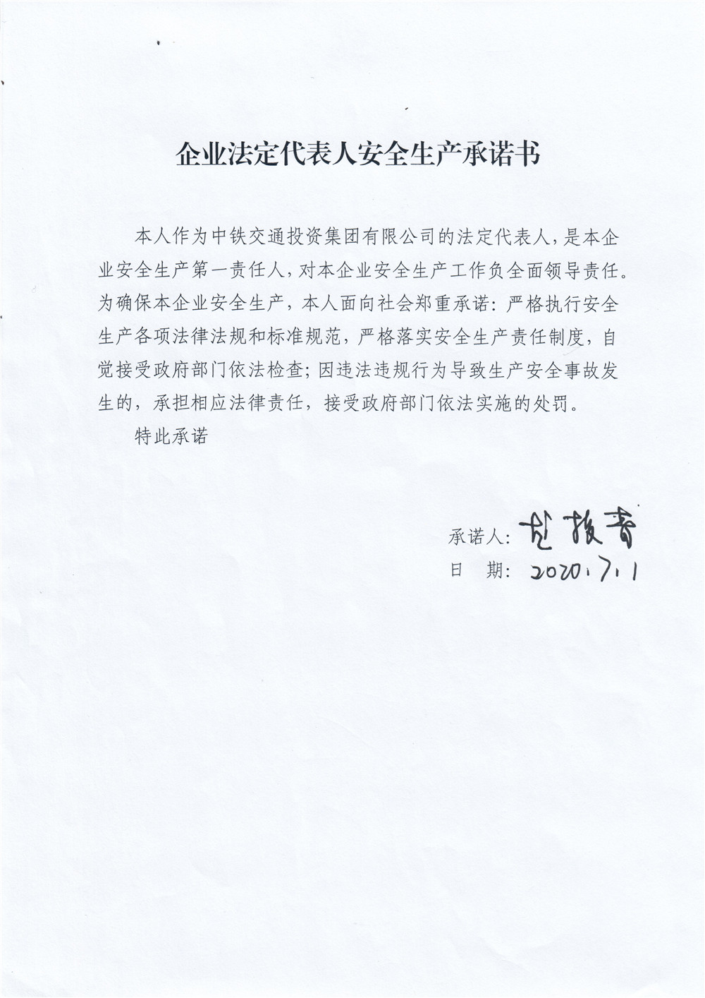 企业法定代表人安全生产承诺书